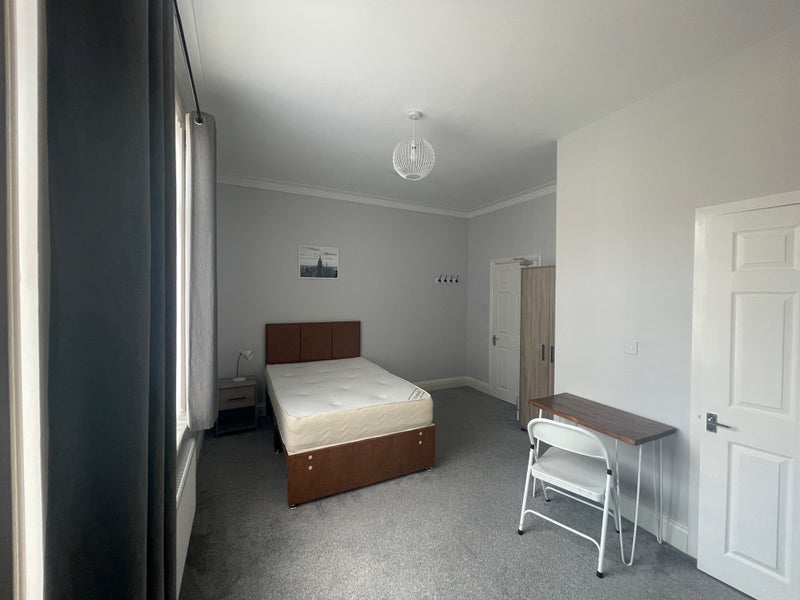 Fully furnished with double bed, bedside drawers, wardrobe, chest of drawers, desk and chair. Coat hooks, mirror and wall art complete the rooms' spacious but cosy feel.