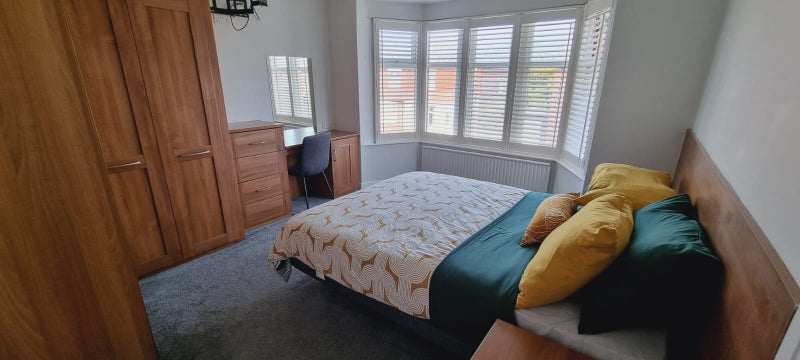 Room 3 - Good size double room on the first floor with fitted wardrobes and king size bed, Plantation window shutter and bay window. It shares a large shower and bathroom with three others and two WCs in the property.