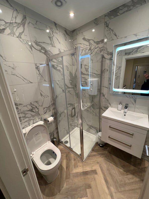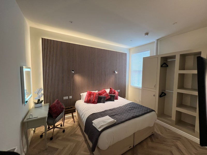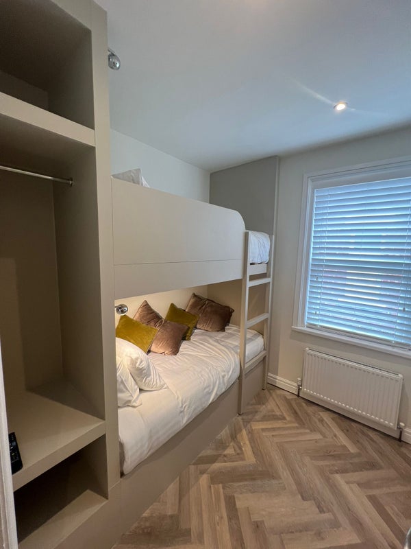 Double rooms come with a Super King bed. with mattress protector. Wardrobes, Two bedside cabinets and remote control bed side lamps. Each room has a TV with Netflix and a Ethernet port There is also a communal lounge available. There one single room with a cabin style bed as well as two double bedrooms