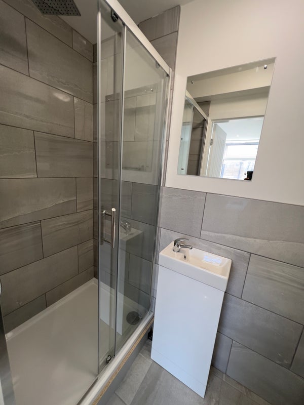 The property features a large communal kitchen, equipped with all the necessary appliances, including a washer and a dining table. The bathroom is fully tiled and includes a shower.