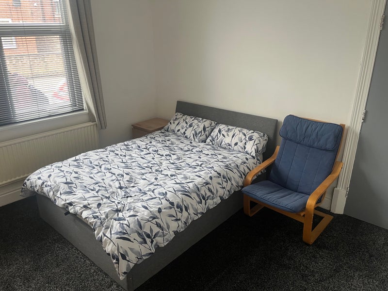 JUST DECORATED: This room is well decorated. It has a brand new carpet, it's been recently repainted, a double bed divan, two Ikea wardrobes plus Ikea bedside cabinet and chest of drawers. Also a funky blue chair.