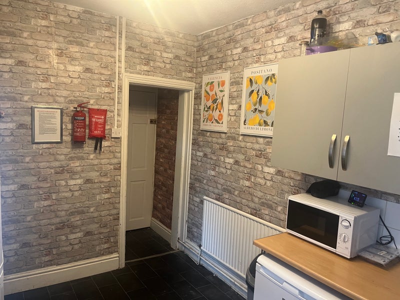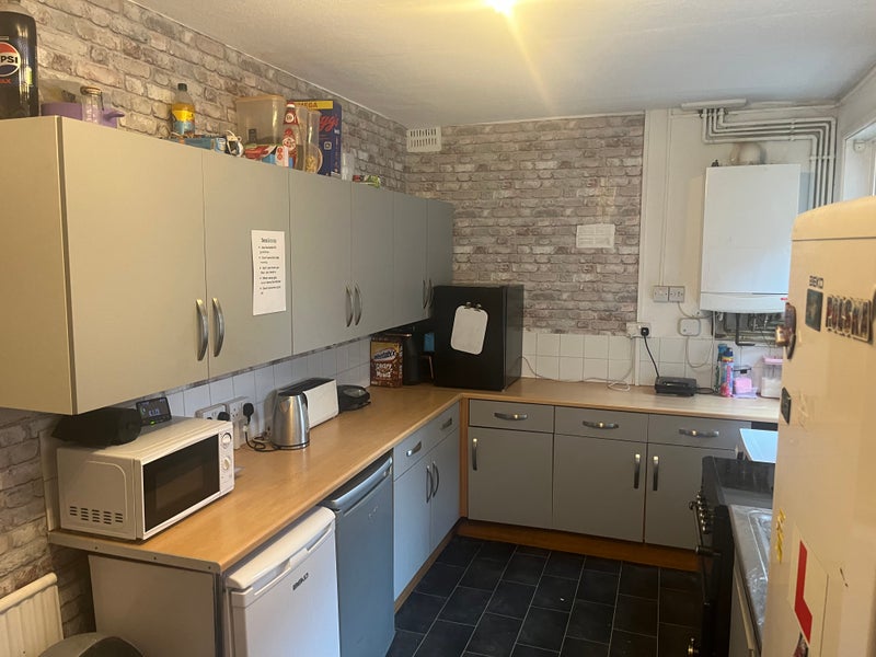 There is a large shared kitchen with specified storage for each room - this is well stocked with washing machine - fridge freezer and single freezer and fridge. Microwave, Air Fryer and Kettle also.