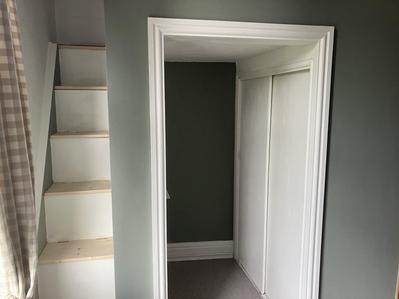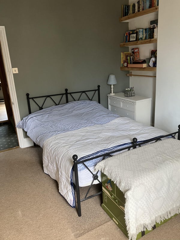 The room is on its own floor.. Double bed and walk in wardrobe. There is a shower en suite and a toilet on the landing that only you use. There is also a study/sitting room opposite that you can use. The room is large and lovely.