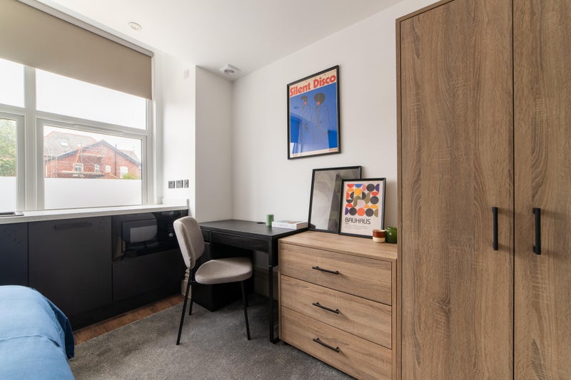 Bright, modern studio featuring a stylish kitchenette with a microwave, sink and fridge, a cosy sleeping area with a double bed, wardrobe, bedside table and desk. Finished with contemporary fittings and plenty of natural light throughout.