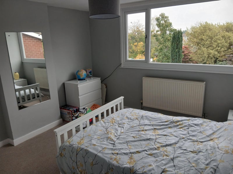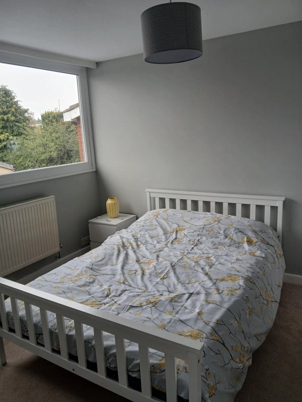 Stay in a spacious double bedroom with bed, wardrobe, chest of drawers and bed side table. Access to shared bathroom, living space, garden and off street parking available too.