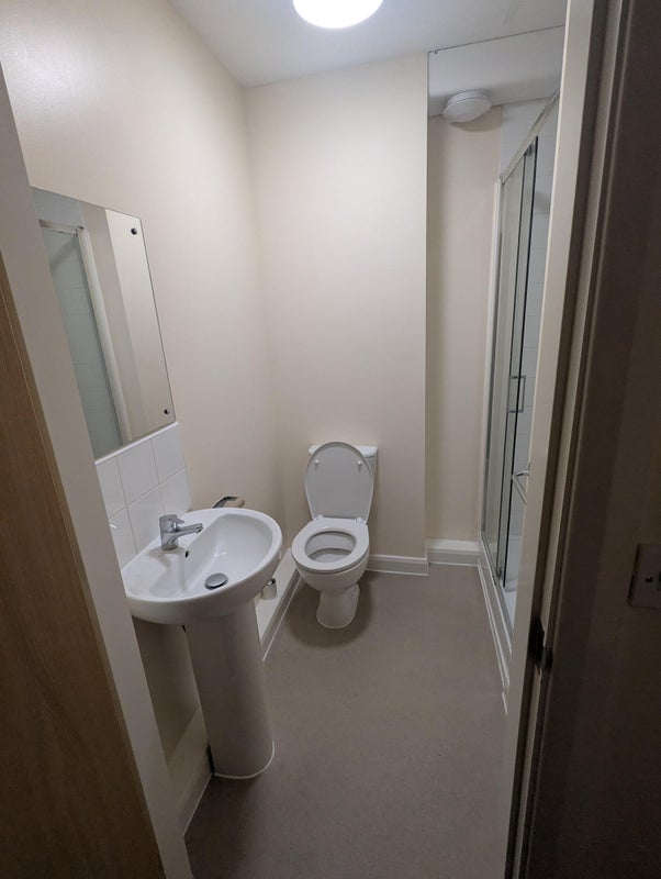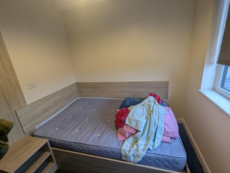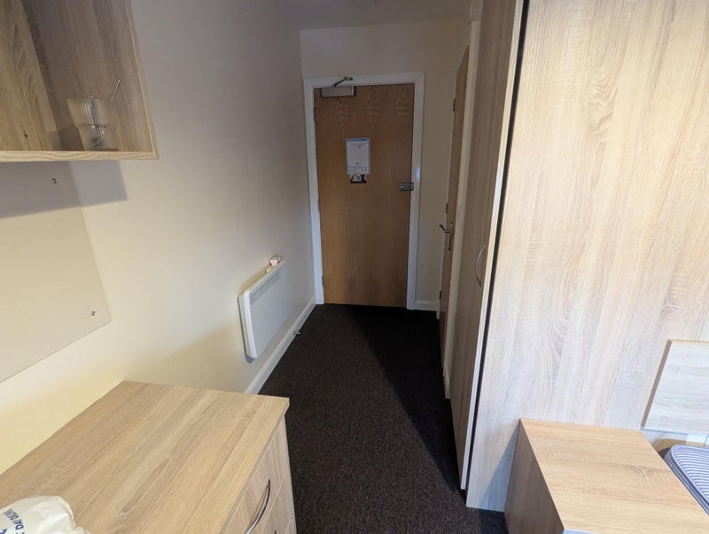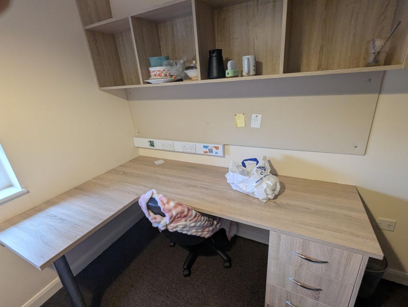 The room is generously sized and fully furnished, featuring a comfortable bed, an expansive desk with an ergonomic office chair, and a large wardrobe with abundant storage space. You will also enjoy the privacy of your own three-piece ensuite bathroom with a shower. Each floor includes a fully equipped, modern kitchen and a shared living area with a TV, perfect for relaxing between lectures.
