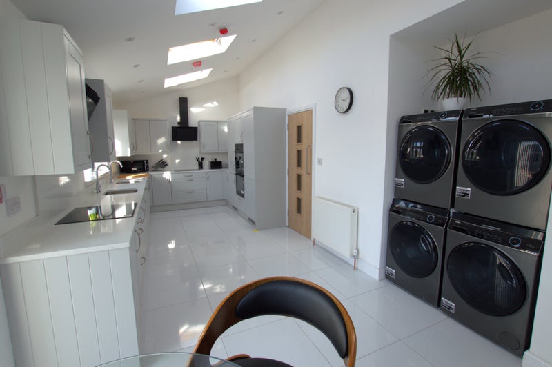 This HOUSE SHARE comprises of FIVE BEDROOMS, all with ENSUITES. A NEW KITCHEN featuring FOUR WASHER/DRYERS, TWO HOBS/OVENS, FRIDGE, and a LARGE FREEZER. Each ROOM consists of an ENSUITE, DOUBLE BED, DESK & a HANGING RAIL.