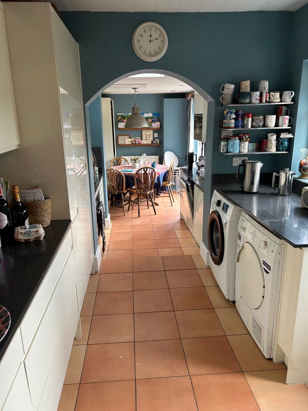 Shared kitchen and living space.