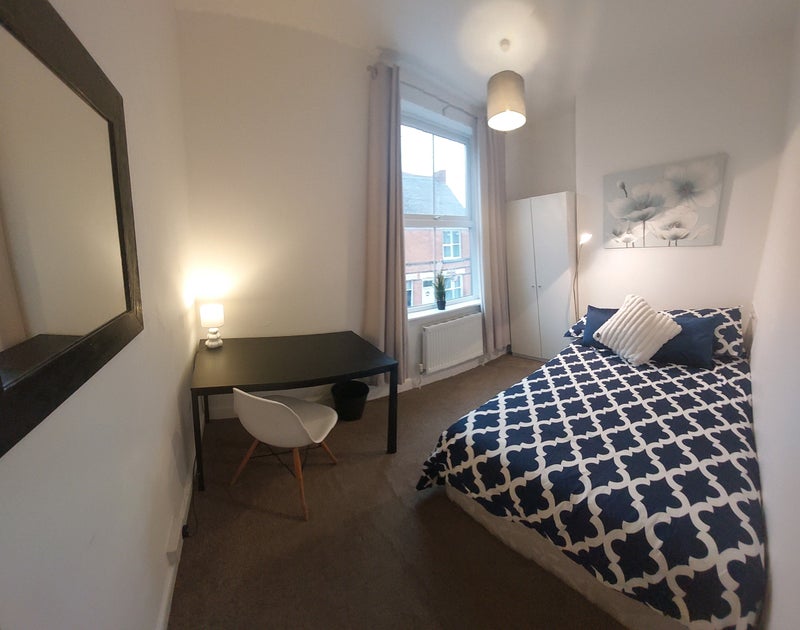 Tastefully furnished double room with desk, wardrobe and Tv in room. Shared Kitchen comes with all working appliances. Shared communal room. Shared store room. This room shares a bathroom with only one other room. Close to university and Clarendon Park. Food outlets and convenience stores 2 mins. Bus stop 1 minute. 10 minute bus ride to city centre.