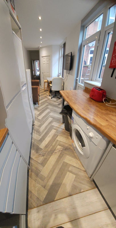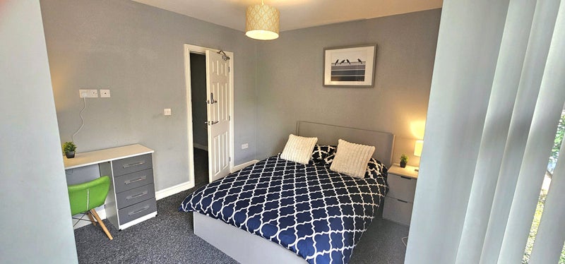 Modern ensuite double room tastefully furnished with wardrobes, cupboards, bedside table, desk etc. Licensed Hmo fully compliant with safety regulations. Kitchen fully equiped with 2 microwaves, 2 sinks, washing machine and dryer, 2 hobs 2 ovens 3 fridge freezers. Just off Narborough road, 10 mins walk to hospital and DMU. Close to all facilities, eateries and supermarkets. Couples welcome at extra £7 pw