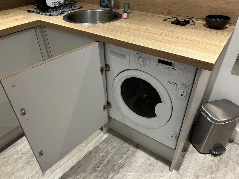 Room is a large studio with a full kitchen, 3/4 size bed (with underneath storage), a sofa, wall-mounted TV, desk, washer/dryer, double wardrobe, and of course a full bathroom. I'd also throw in a coffee table that I brought in myself.