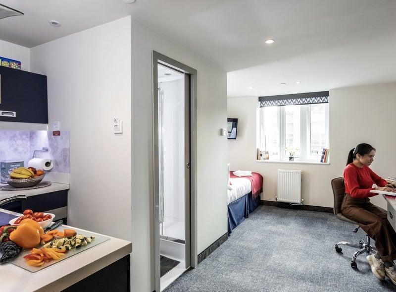 Within a Gold Plus studio room you will find a double wardrobe, desk space, 32-inch flatscreen smart TV, kitchen and bedding essentials upon arrival, superfast up to 1 Gb Wi-Fi, and much more!