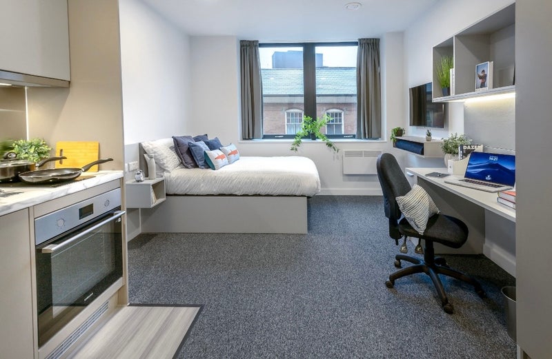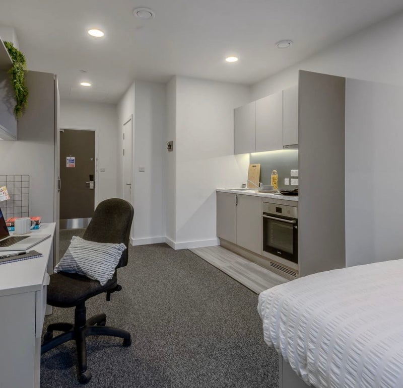The Classic Studio at True Student Leicester is a modern, fully self-contained student studio designed for comfort and privacy. The room includes a small double bed with under-bed storage, a private en-suite bathroom, study desk and chair, wardrobe space, and a fully equipped kitchenette with a hob, microwave, sink, and fridge/freezer. The studio is ideal for students who prefer independent living while still being part of a social student community.