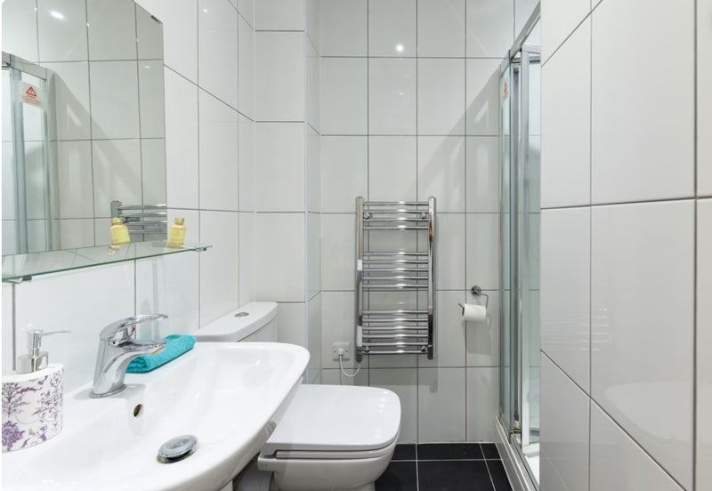 -En suite bathroom with shower cubicle and a heated towel rack.