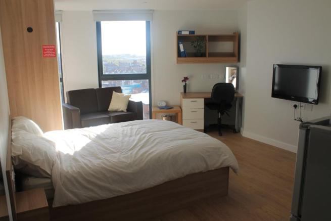 The studio flat itself is very well furnished. The living space includes a double bed, two seater sofa or 2 tub chairs and a wall mounted flat screen TV. The kitchen has a built-in oven, 4 ring hobs as well as a microwave.