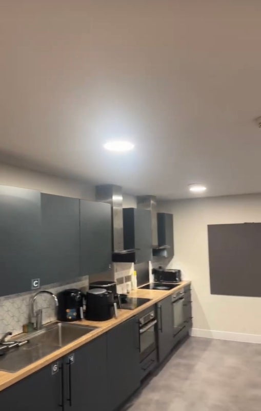 - Shared open-plan kitchen with 2 hobs, 8 cooking stations, 2 ovens, 2 large fridges and 2 sinks