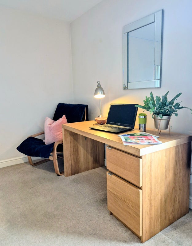 • Double bed, bedside table, desk & easy chair