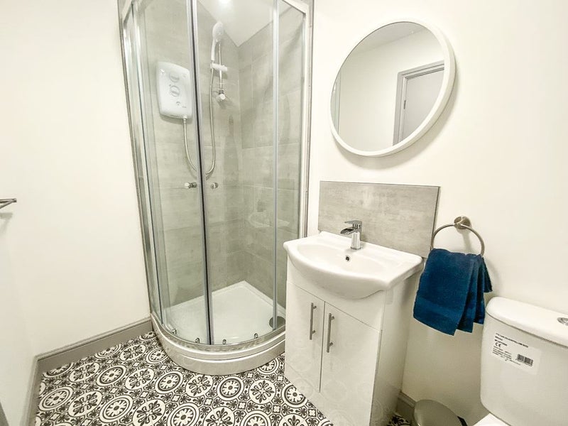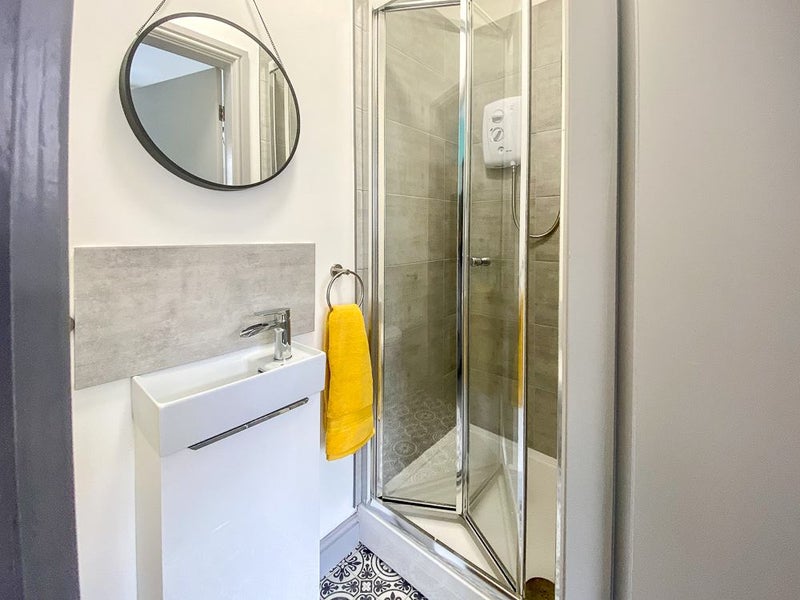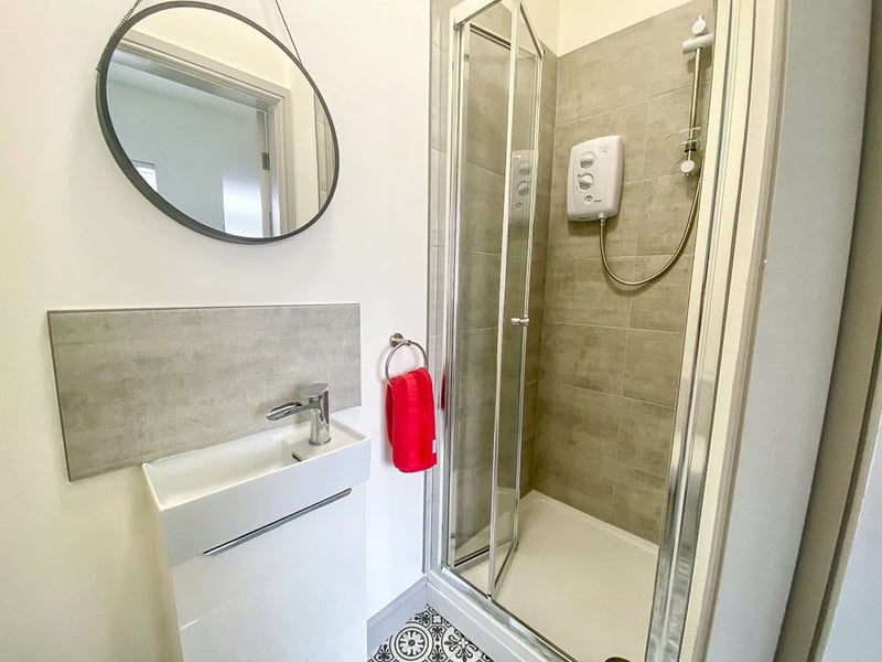 Your private shower room, located on the first floor, features a walk-in shower, washbasin, and WC, with ample room for storage cabinets.