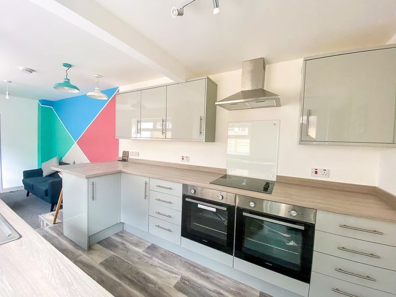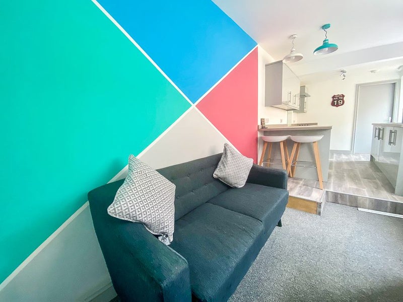 The spacious kitchen/diner is designed for modern shared living, complete with two ovens, hob, microwave, large fridge-freezer, crockery, cutlery, utensils, and more. There’s also a breakfast bar, comfy sofa, and a large-screen TV — perfect for relaxing or socialising with housemates.