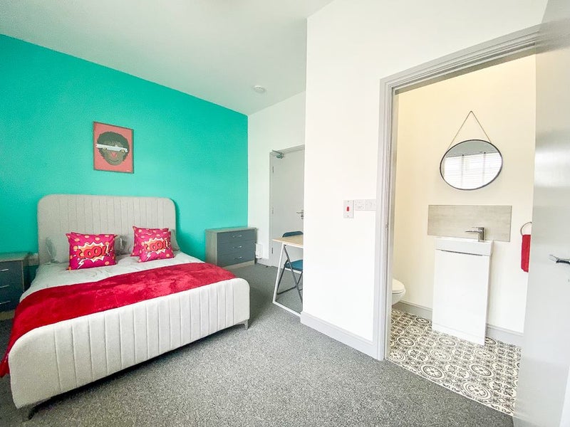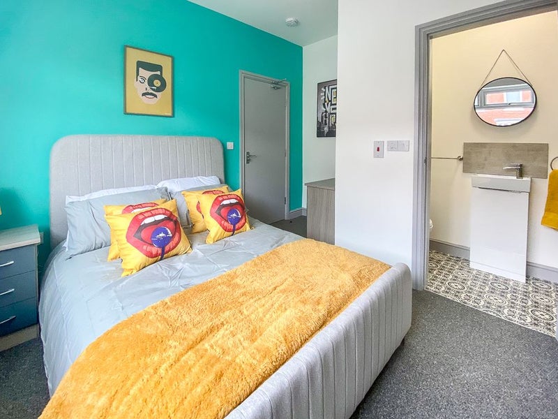 This ground-floor room is bright and stylish, decorated in fun, contemporary colours. It comes fully furnished with a double bed, wardrobe, bedside units, fresh new bedding, and coordinating accessories — everything you need to move straight in.