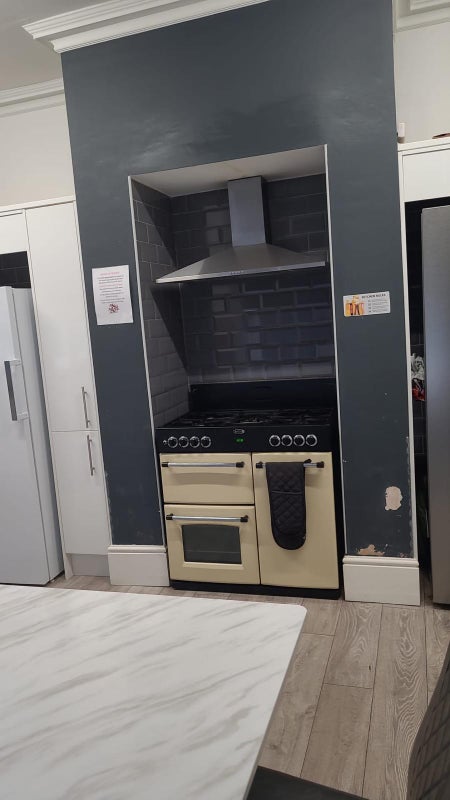 ***High-End Appliances: Features a classic range-style cooker, microwave, kettle, toaster, and individual laundry facilities.