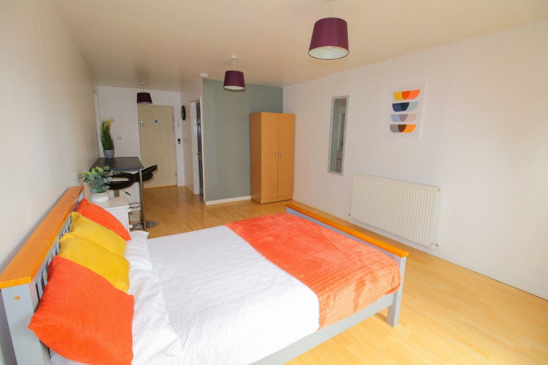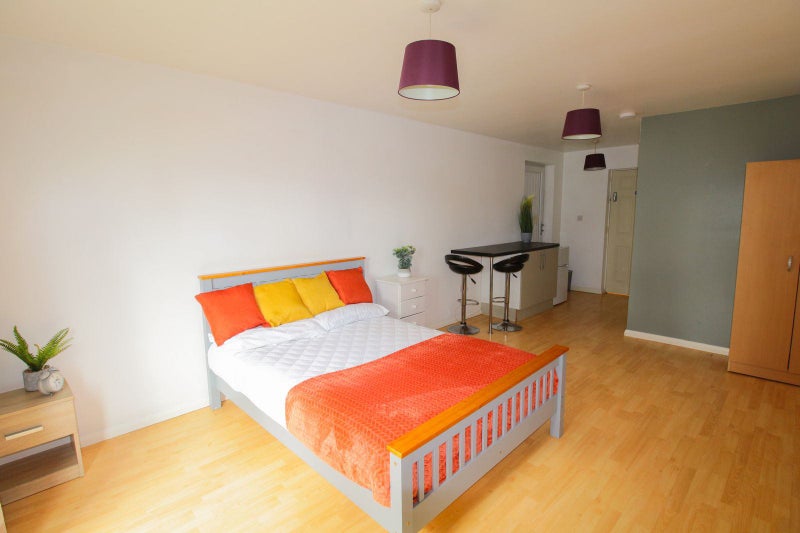The spacious double En-Suite room comes fully furnished with a double bed, wardrobe, chest of drawers, bedside cabinet, and a private fridge freezer.