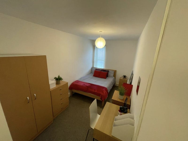 🛏 Spacious double bedroom – fully furnished with a comfy bed, wardrobe, desk, chair, and chest of drawers.