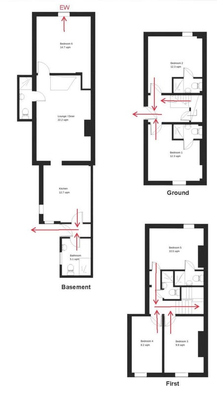 The residence comprises six generously sized bedrooms and two shared bathrooms, offering a practical setup for shared living.