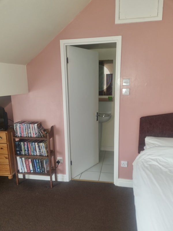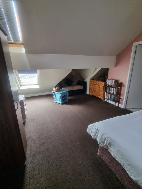 I am seeking a lodger for my upstairs en-suite attic room. It has a double bed, its own loo and shower room, small wardrobe and cupboards and a small snug area with sofa and TV. The room has sloping ceilings and velux windows.