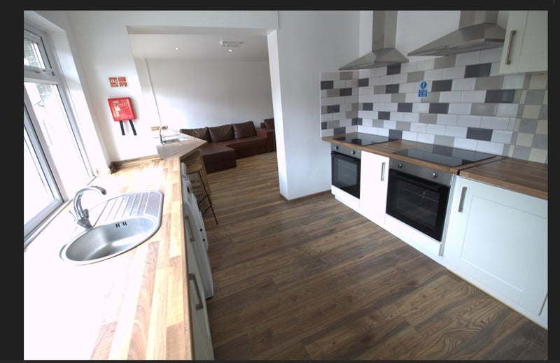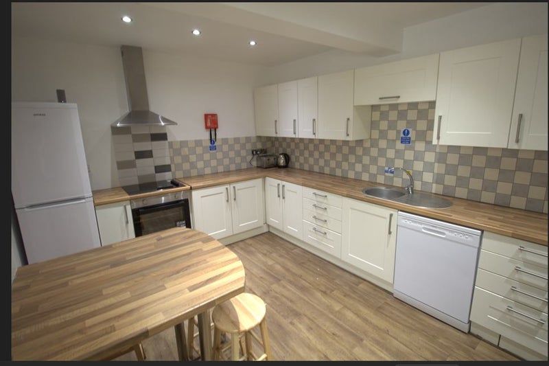The double room comes fully furnished with a double bed, wardrobe, chest of drawers, bedside cabinet, and a private fridge freezer.