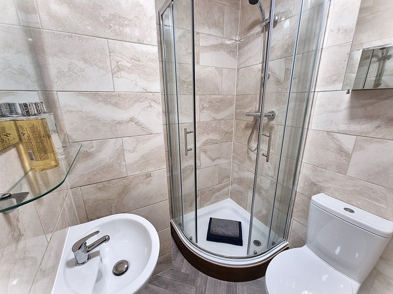 Private en-suite with shower, basin and WC.