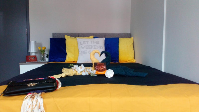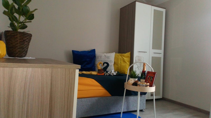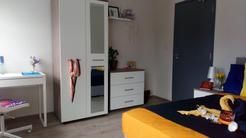 • Spacious, private lockable room – bed, wardrobe, desk & chair