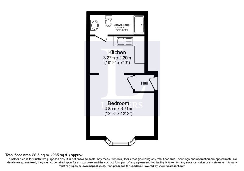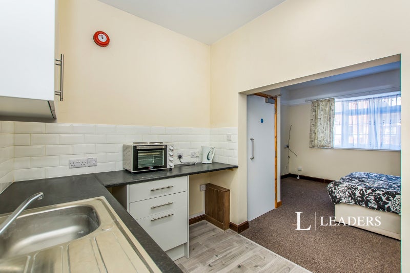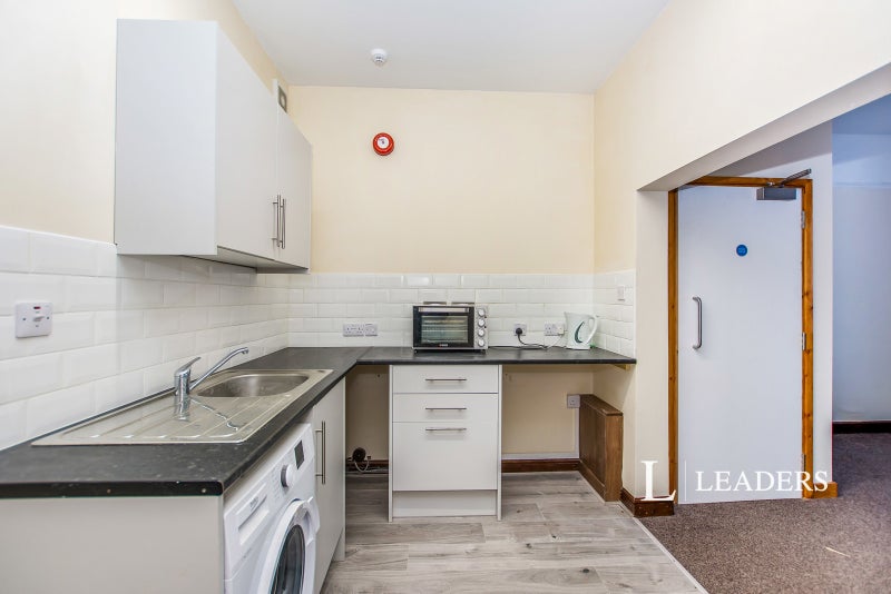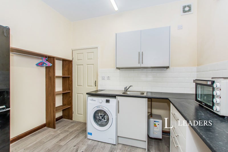 This ground floor studio offers a double bedroom/living area, a BRAND NEW modern fully fitted kitchen with freestanding BEKO washing machine, counter top cooker and hob, under counter fridge, A dining space offering a table and chairs for two and built in clothing rails.