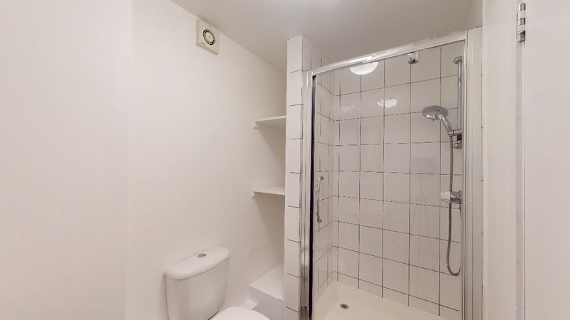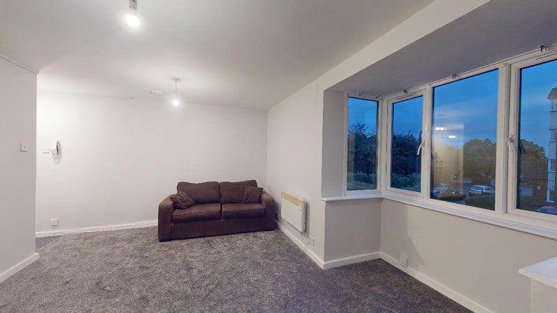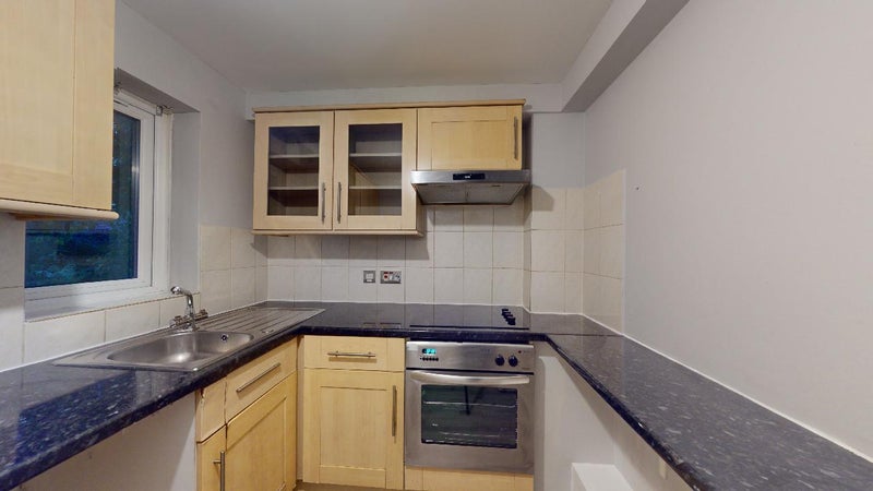 The studio flat features a semi-open plan kitchen, fully equipped with an electric oven, hob, extractor fan, washing machine, under-counter fridge, and a free-standing freezer.