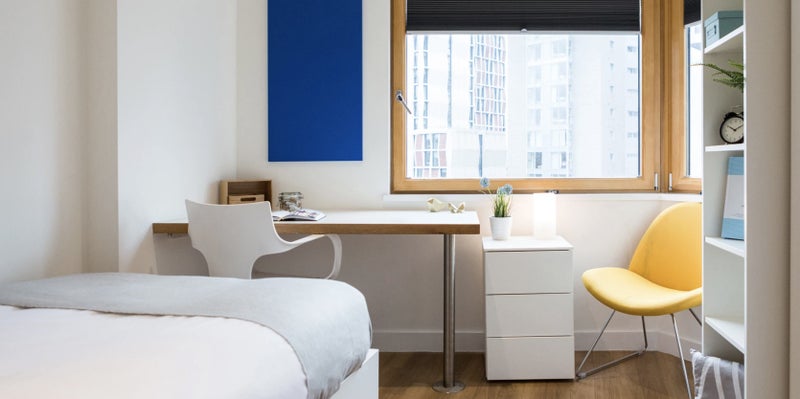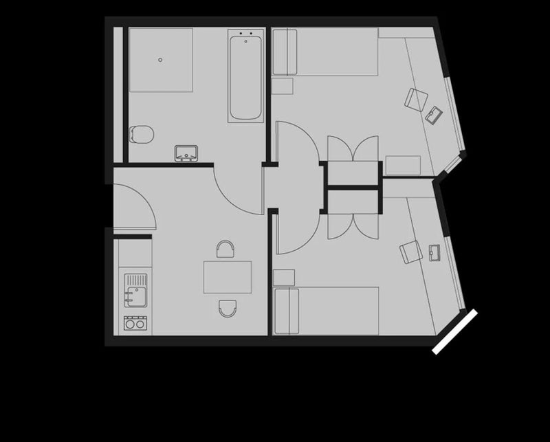 2 bed apartments are a total of 35 SQM in size. Each room contains a bed, storage space and desk and chair. Apartments also include a shared kitchen and En suite bathrooms with a shower and bathtub.
