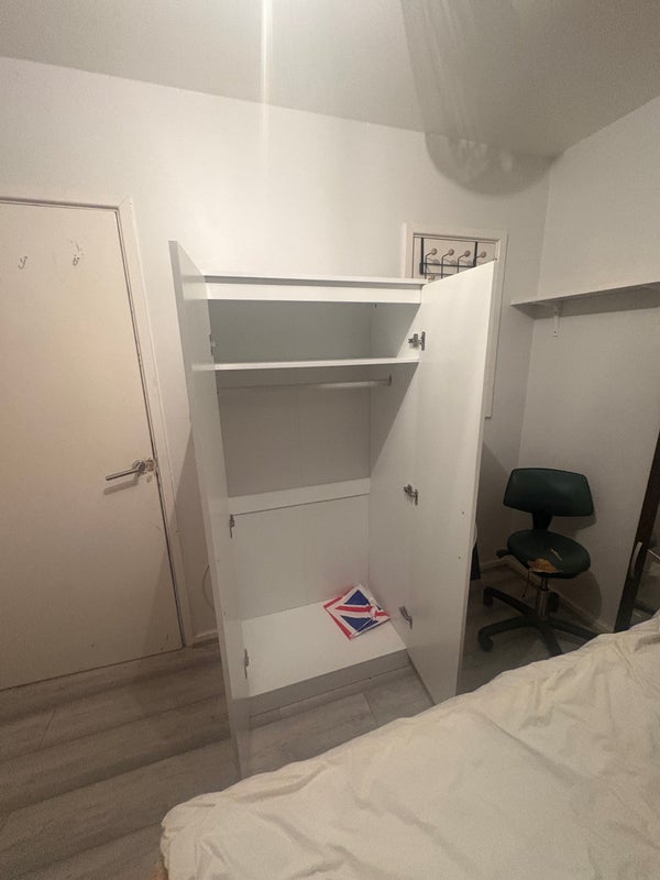 • Furnished with a small double bed, wardrobe, chest of drawers, and TV