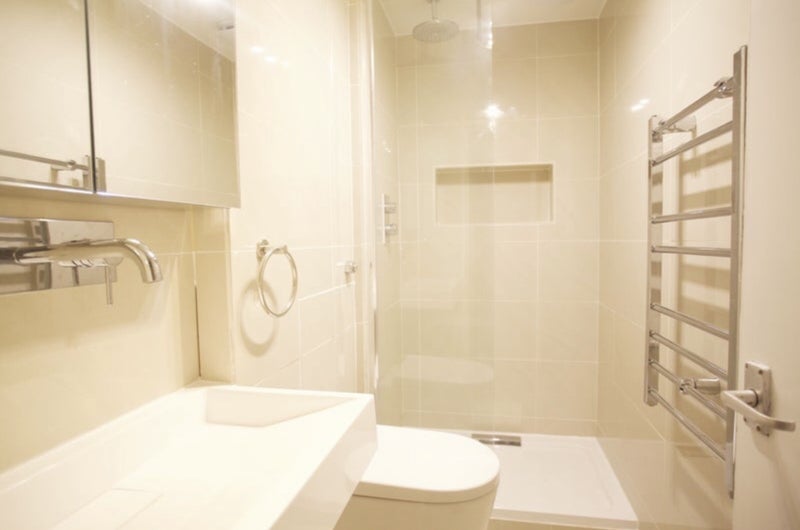 The Bathroom: A clean bathroom featuring a walk-in shower with a glass screen and a heated towel rail.