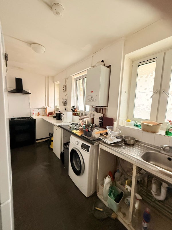 The Flat: Modern, refurbished 5-bedroom apartment with a fully equipped kitchen (washing machine, fridge/freezer, etc.) and a clean, spacious shared bathroom.