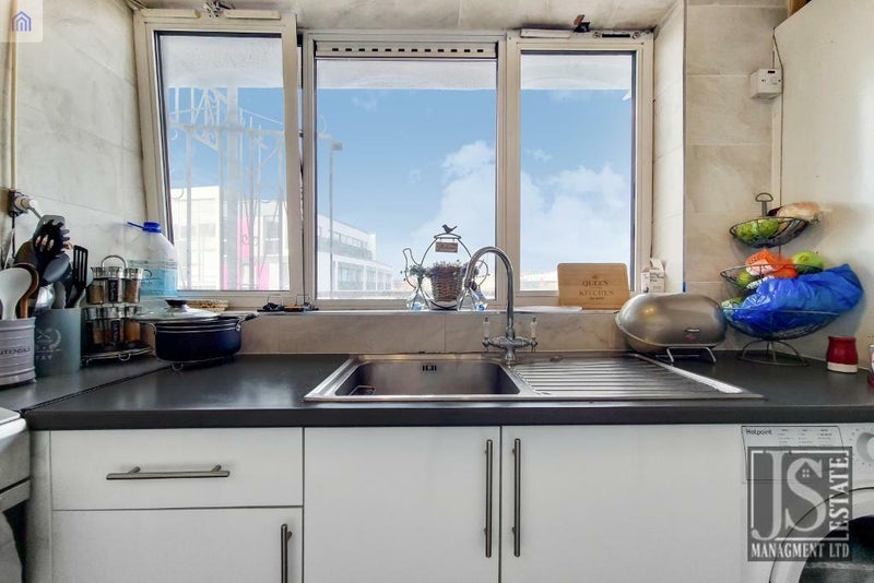Large windows and a balcony fill the flat with plenty of natural light, making it feel bright and airy.