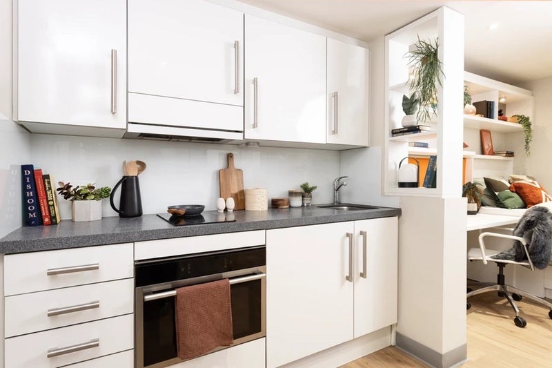 - Comes with a combi-microwave oven, induction hob, and fridge