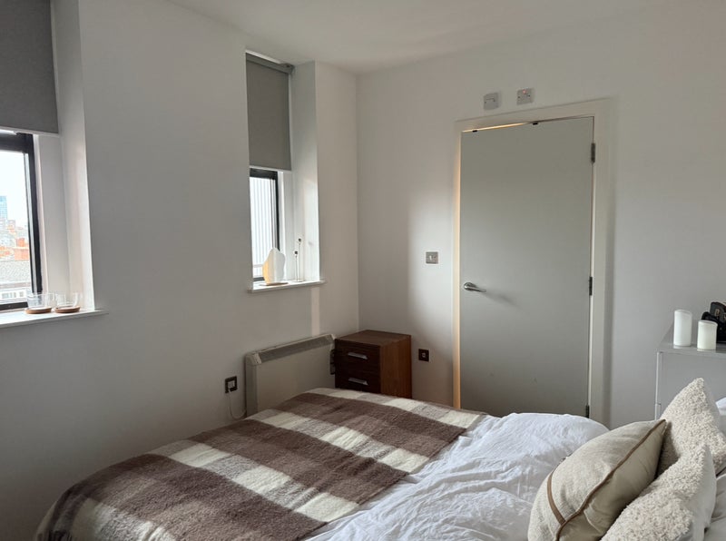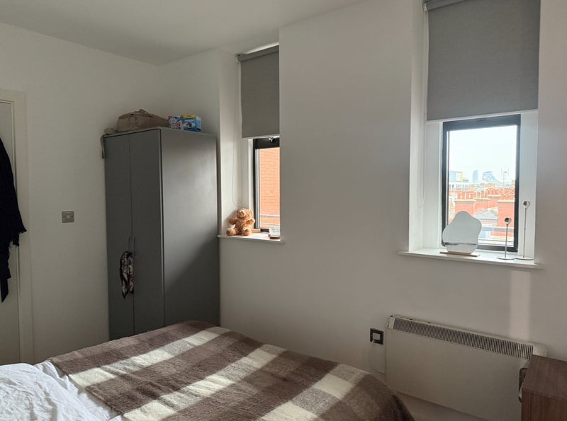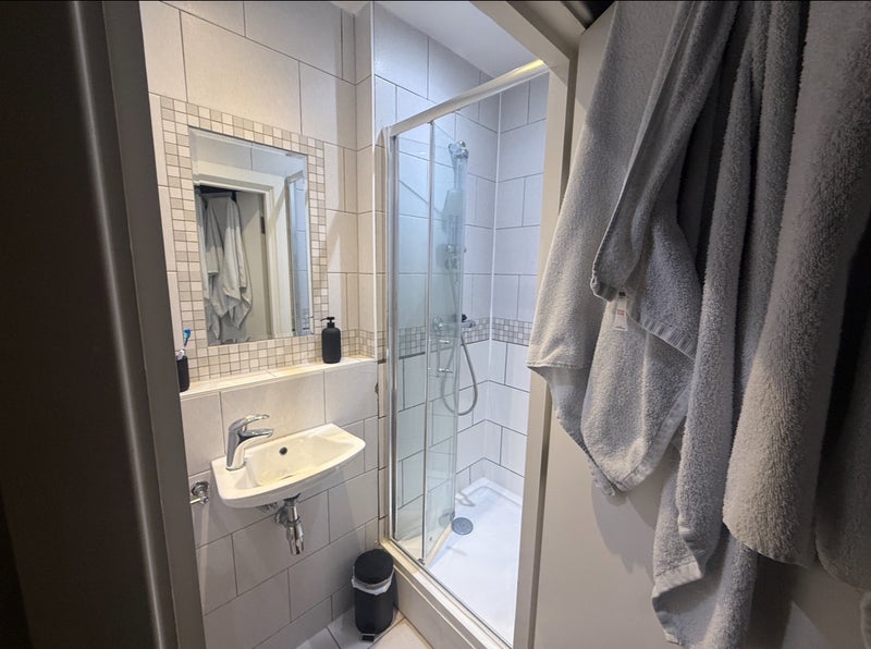 The room benefits from good natural light with rooftop views across the city, and comes with a double bed, wardrobe, chest of drawers, and bedside storage. The private en suite includes a shower, sink, and toilet — no sharing required.