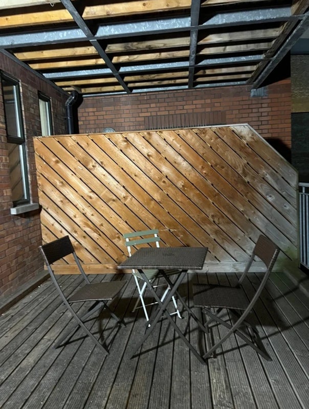 The flat also includes a shared kitchen, spacious living area, and access to a covered outdoor terrace with seating — a great spot to relax or socialise. The building has 24/7 reception for added security and convenience.