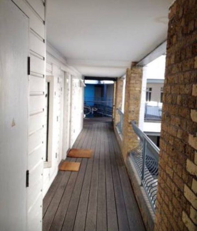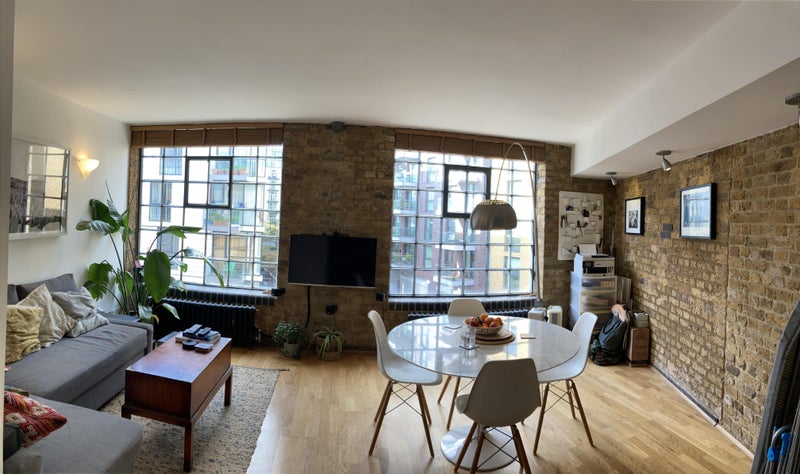A two-bedroom flat with a shared bathroom, kitchen, and lounge featuring exposed brickwork and large warehouse windows (with secondary glazing).