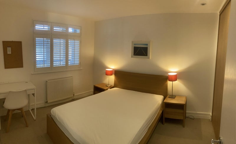 Furnished with a double bed, desk & chair, and mirror sliding door wardrobe with ample storage.
