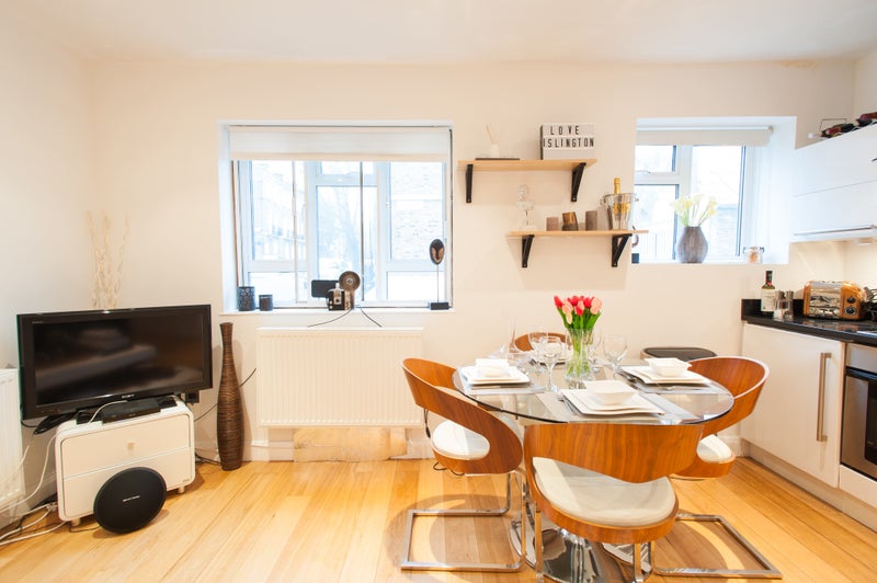 Interior designer furnished, newly decorated luxury 1 bed flat. In the heart of ever popular Angel. Fully equipped and furnished at AirBNB standard, tenants just need to bring their suitcases. Furnished to high standard with good quality furniture. Open plan lounge / kitchen. Fully fitted kitchen with wm, dishwasher and all utensils, good sized bedroom, luxury bathroom. Excellent central London location. Very close to Upper Street, Essex Rd Train Station and Angel Tube Station. 10-15 minutes to everywhere in central London.
