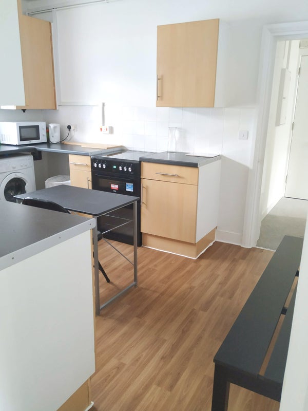 The flat has a bathroom with handheld shower and bath and a spacious eat-in kitchen and dinning space with modern appliances (separate washing machine, electric hob) with plenty of storage .There is also a bike shed downstairs.