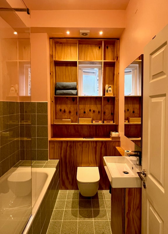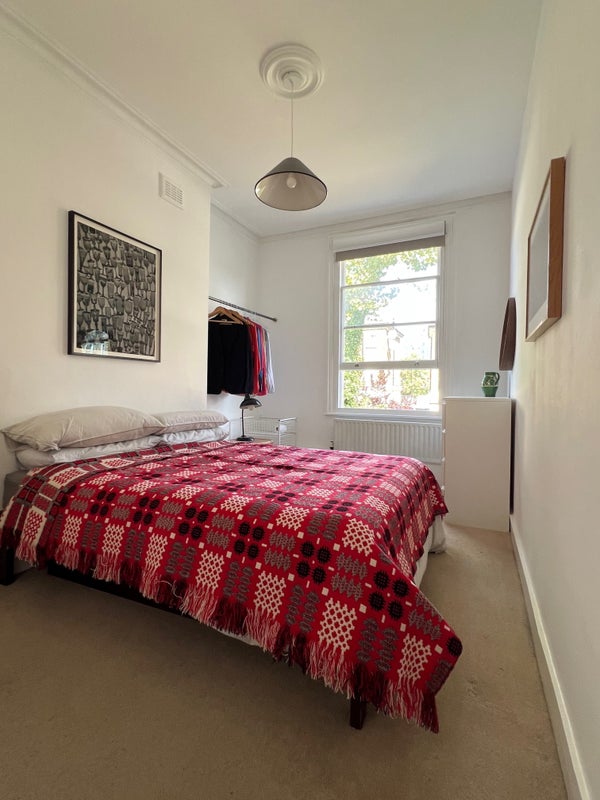 I'm an artist and curator and most days I am working at my studio nearby. The flat is brightly coloured with lots of art, and there is a new kitchen and bathroom refurbished one year ago. The bedroom is simple and uncluttered and with a large North-facing window overlooking a huge backgarden. Black-out blinds, and with two dressers for storage, a rail for clothes.