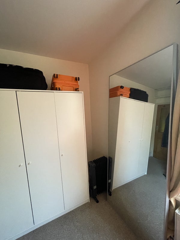 The room is quite small and equipped with a bed, a shelf and a wardrobe but no desk (when I need a table I use the big one in the living room/kitchen). You would share a bathroom with Kelly and Julius.