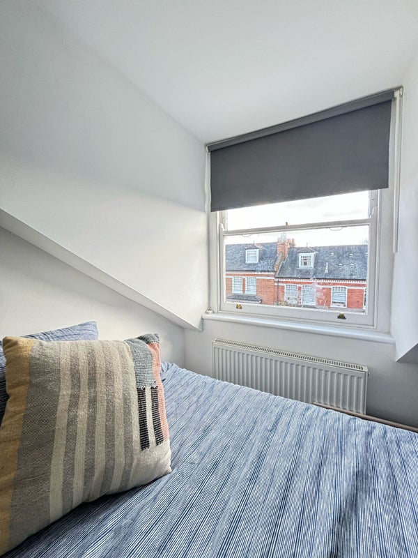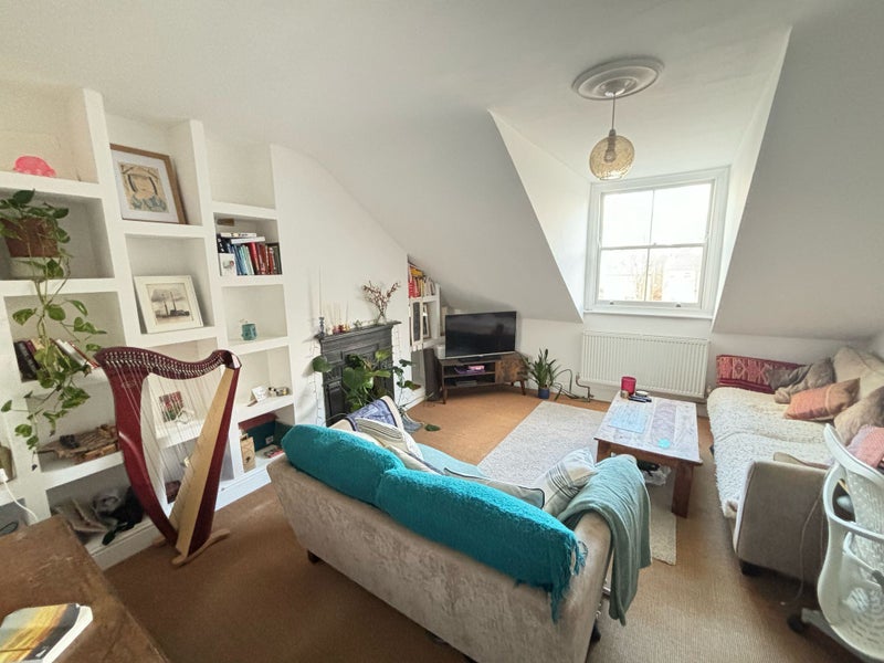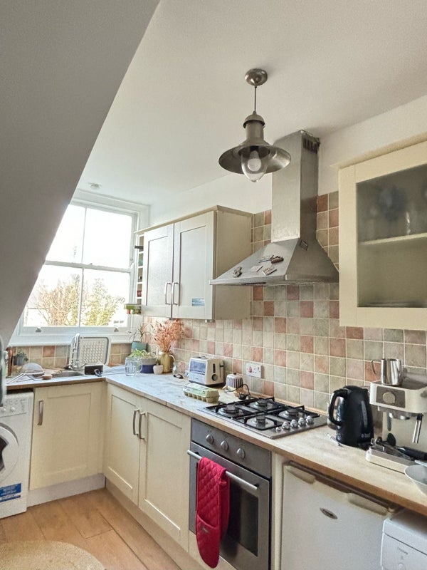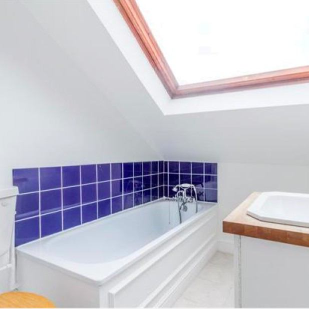 The living room and kitchen overlook the communal garden, and being at the top of the house, also have extremely pleasant views of the surrounding area. The living room has two double sofas and a wall of built-in shelving. The fitted kitchen has an oven, fridge, washing machine, dishwasher and a breakfast bar. The bathroom is white and bright, with a large skylight. The bath has a shower attachment.