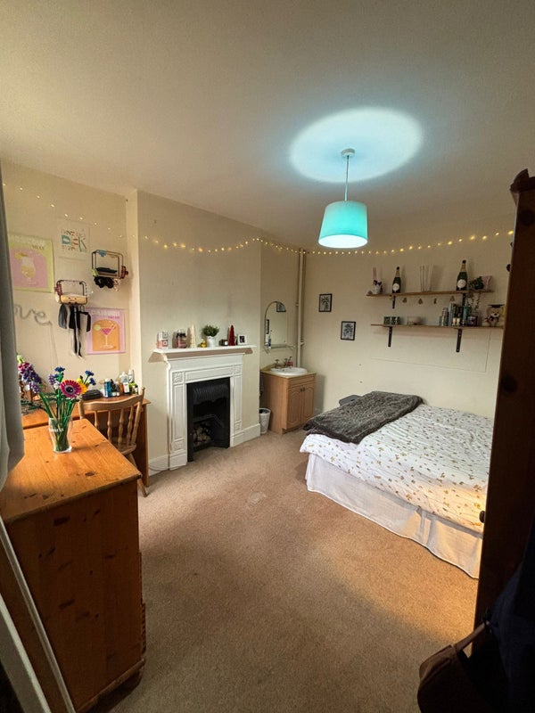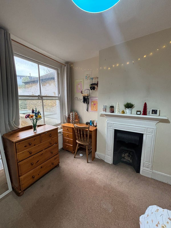 The double bedroom is on the first floor and comes fully furnished (bed, wardrobe, sink, chest of drawers, desk, bedside table). There is also extra storage built in under the bed. The room is at the back of the house, so it’s very quiet and peaceful. There's a lovely period fireplace and a big sash window for lots of natural light.